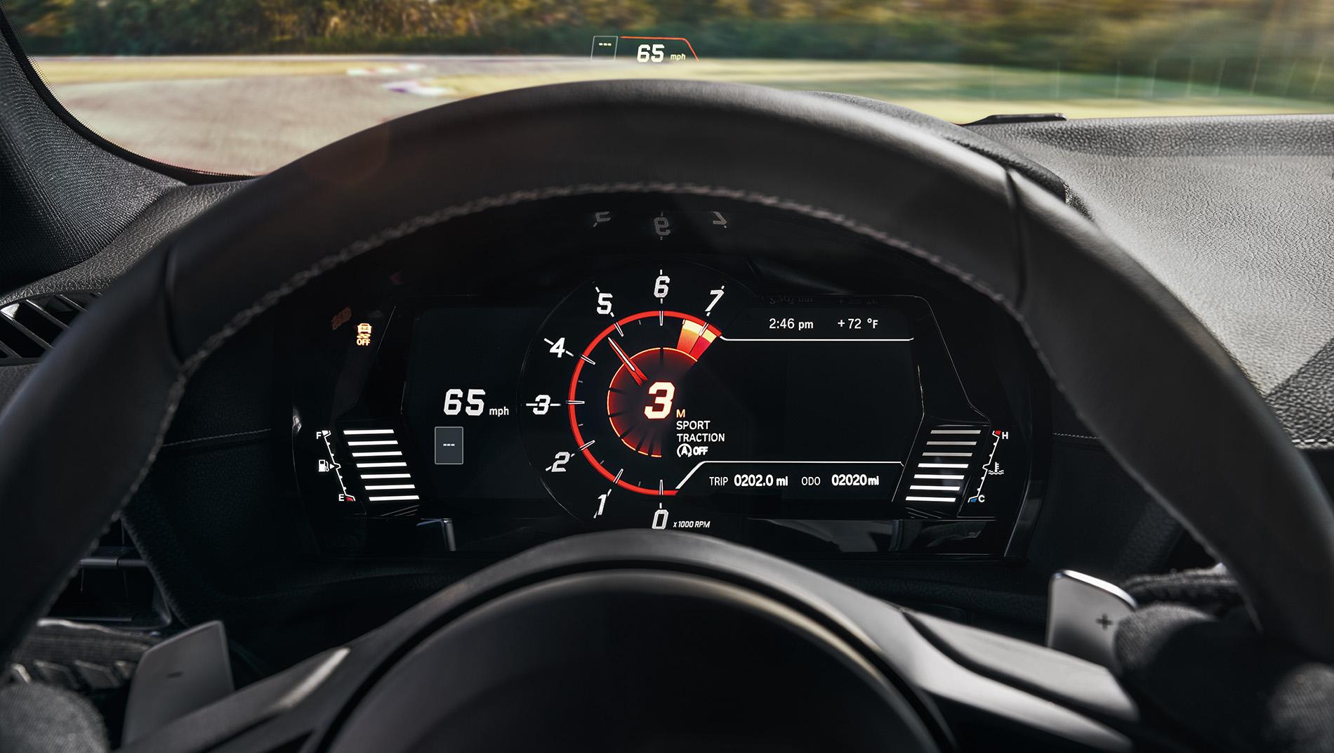 Pantalla digitalLa pantalla de alta resolución de 8.8 plg se encuentra en el conjunto de indicadores del GR Supra, mientras que en el centro se aloja un tacómetro tridimensional que te muestra la velocidad del motor, la marcha actual en la que vas y la marcha sugerida. Está flanqueado por pantallas que se pueden personalizar para mostrar la velocidad, la navegación y otra información importante de manejo.