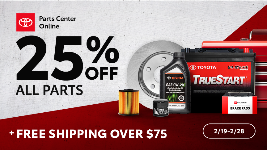 Now is the perfect time to receive 25% Off Sitewide Genuine Toyota Parts PLUS Free Shipping on orders over $75 . Select your dealer to order your parts online and have them shipped right to your front door. Offer valid 2/19/2026 - 2/28/2026.